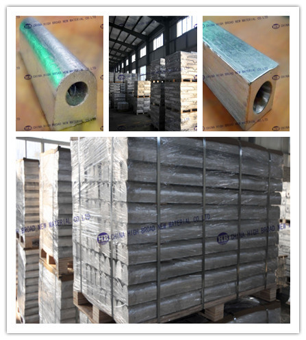 Main Application: Aluminum anodes are suitable for the cathodic protection for such metal structures as ships, machinery, offshore engineering, harbor facilities, and pipings and cables in an ooze corrosion environment.